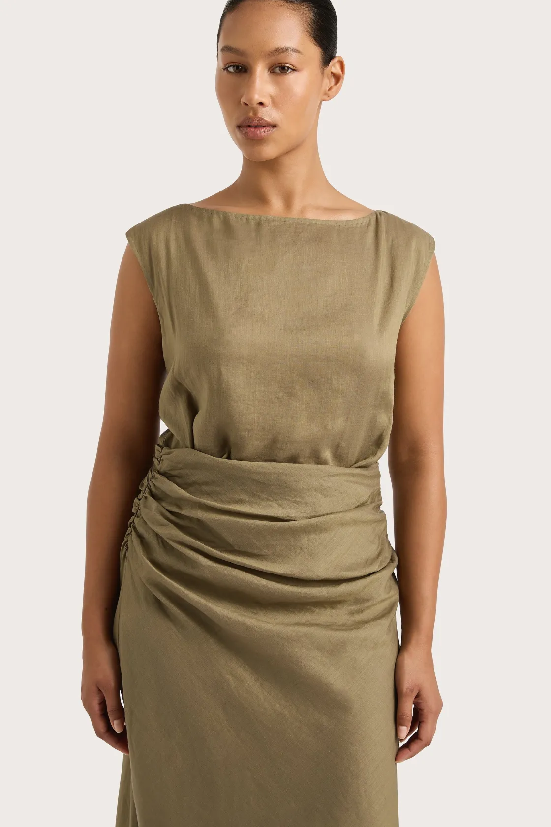 A sleeveless maxi dress with a boat-style neckline that sits slightly down on the shoulder. There is gathering across the bodice and around the waist, which then leads into a relaxed A-line skirt with a bias cut that crops around the ankles. It is designed from a blend of ramie and silk, meaning it is both delicate and soft to the touch. Offered in a light khaki colourway, it is designed for effortless day to night occasionwear. This style is true to size. Please note there is no elastic woven into the fabric so it does not offer any additional stretch. As it is designed from a delicate fabrication, it must be hand washed and/or dry cleaned.