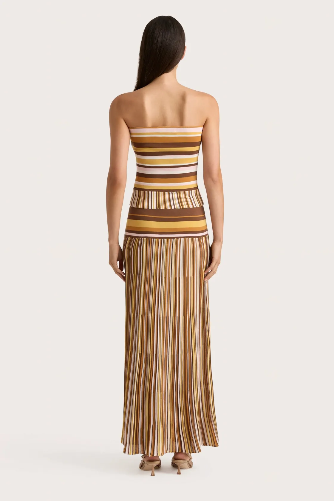A fitted strapless top, designed in FAITHFULL’s signature stripe and a true knit fabrication. With elastane woven through the bust for additional support, it is cropped short at the waist to sit in line with the Citara Skirt. Style the pieces together for elegant, transeasonal occasionwear. Semi-sheer in finish, wear over neutral intimates.